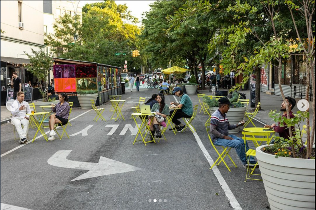 That effort —initiated by transportation activists associated with North Brooklyn Open Streets and the North Brooklyn wing of Transportation Alternatives and backed by numerous local elected officials— has yielded the temporary closure to traffic on the one block stretch of Bedford between Manhattan and Lorimer, but is still waiting on the Department of Transportation’s approval to make the change permanent. You can sign their petition in support of the project here.